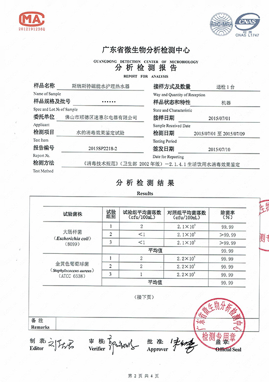 斯瑞斯特磁能熱水器不只是單純給生活用水進(jìn)行加熱,更主要能明顯提升水質(zhì),通過(guò)檢測(cè)中心的水質(zhì)苛刻檢測(cè),經(jīng)過(guò)斯瑞斯特磁能熱水器入門級(jí)產(chǎn)品小廚寶加熱出來(lái)的水質(zhì)符合并超越直飲水的標(biāo)準(zhǔn)。以下是水質(zhì)檢測(cè)報(bào)告文件: