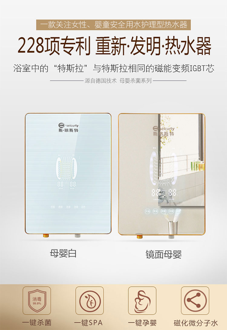 斯瑞斯特磁能熱水器的好用之處在于實用的功能和貼心的機型設(shè)計。斯瑞斯特?fù)碛卸囗棇@夹g(shù),熱水器的一些實用功能設(shè)計運用了這些專利技術(shù)的一部分,因此斯瑞斯特?zé)崴鞯膸追N功能是獨一無二的。脈沖磁場殺菌、水質(zhì)磁化和自動反沖洗水垢功能皆是專利技術(shù)的應(yīng)用,這些功能可以讓水體發(fā)生良好的改變,保證了加熱后所出的熱水都是有益、無菌無污染的。除了這幾個功能外,斯瑞斯特?zé)崴鬟€帶有孕嬰和水療功能,孕嬰功能自動調(diào)節(jié)合適溫度,方便各位父母幫嬰兒洗澡;使用水療功能夠促進身體血液循環(huán)、新陳代謝、放松肌肉、軟化軟組織。