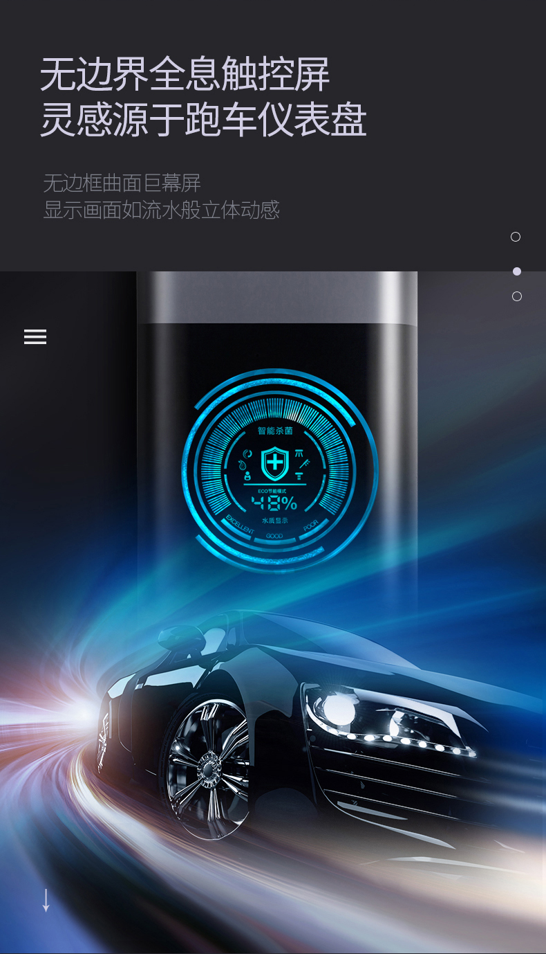 未來的沐浴體驗,從悅目開始。斯瑞斯特磁能淋浴屏智能款采用賽車跑道弧形設(shè)計,一體成型,配合跑車烤漆工藝,高端大氣之余更是平添幾分時尚和青春氣息;此外這款淋浴屏更是采用了無旋鈕極簡設(shè)計,讓整臺機(jī)器的外觀更加簡約、干練??梢哉f,斯瑞斯特智能款淋浴屏正是對未來科技產(chǎn)品外觀的極致追求。