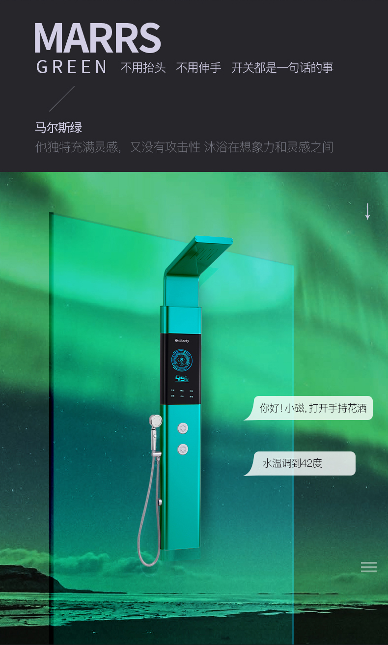 AI語音控制,“浴”見智慧。斯瑞斯特磁能淋浴屏智能款內(nèi)置人工智能AI“小磁”,它能夠迅速反應(yīng)用戶所下達(dá)的語音命令,無論開關(guān)、調(diào)節(jié)溫度還是功能變換,只要一聲令下,“小磁”都能在超短的時間內(nèi)反應(yīng)并且完成,讓用戶“浴”見智慧,真正享受到人工智能帶給生活的便利。